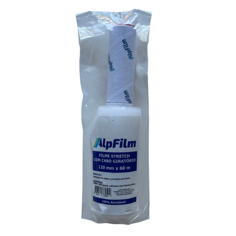 Uma unidade de AlpFilm PE Stretch com Manopla (Cabo Giratório) possui 12 cm de largura e 60 metros de comprimento.