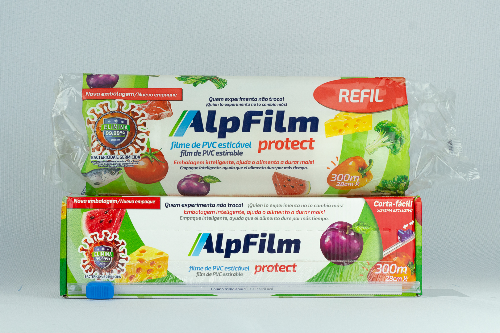 Alpfilm Protect é um plástico-filme inovador e o único do mercado que possui escudo de proteção antibacteriana. Esse escudo potencializa a conservação dos alimentos, pois elimina 99,96% dos micro-organismos que causam intoxicações alimentares. É também um produto em conformidade com a legislação do Brasil, Mercosul e Europa para contato com alimentos gordurosos. Só Alpfilm conserva seus alimentos por muito mais tempo e protege a sua saúde.
